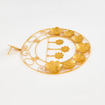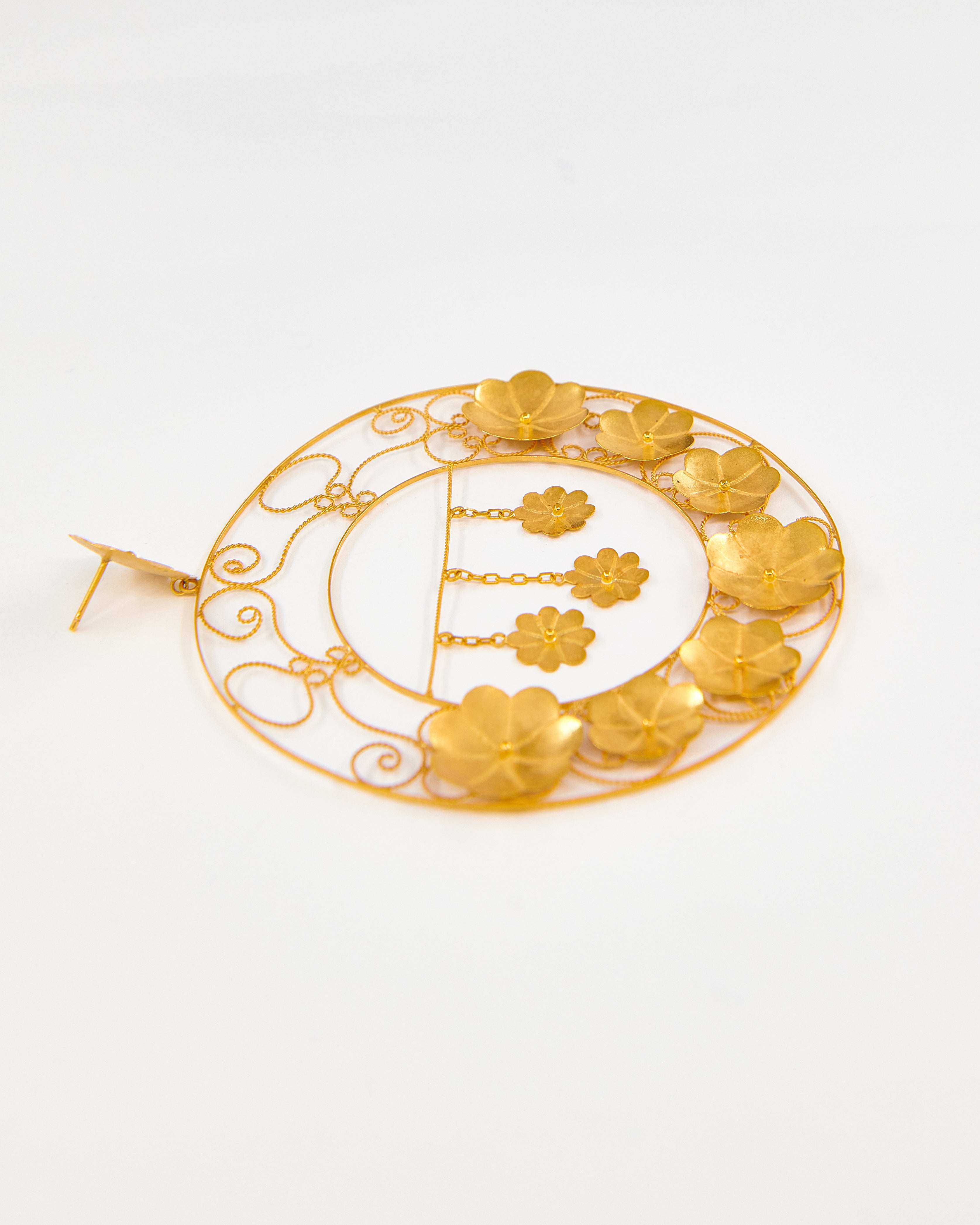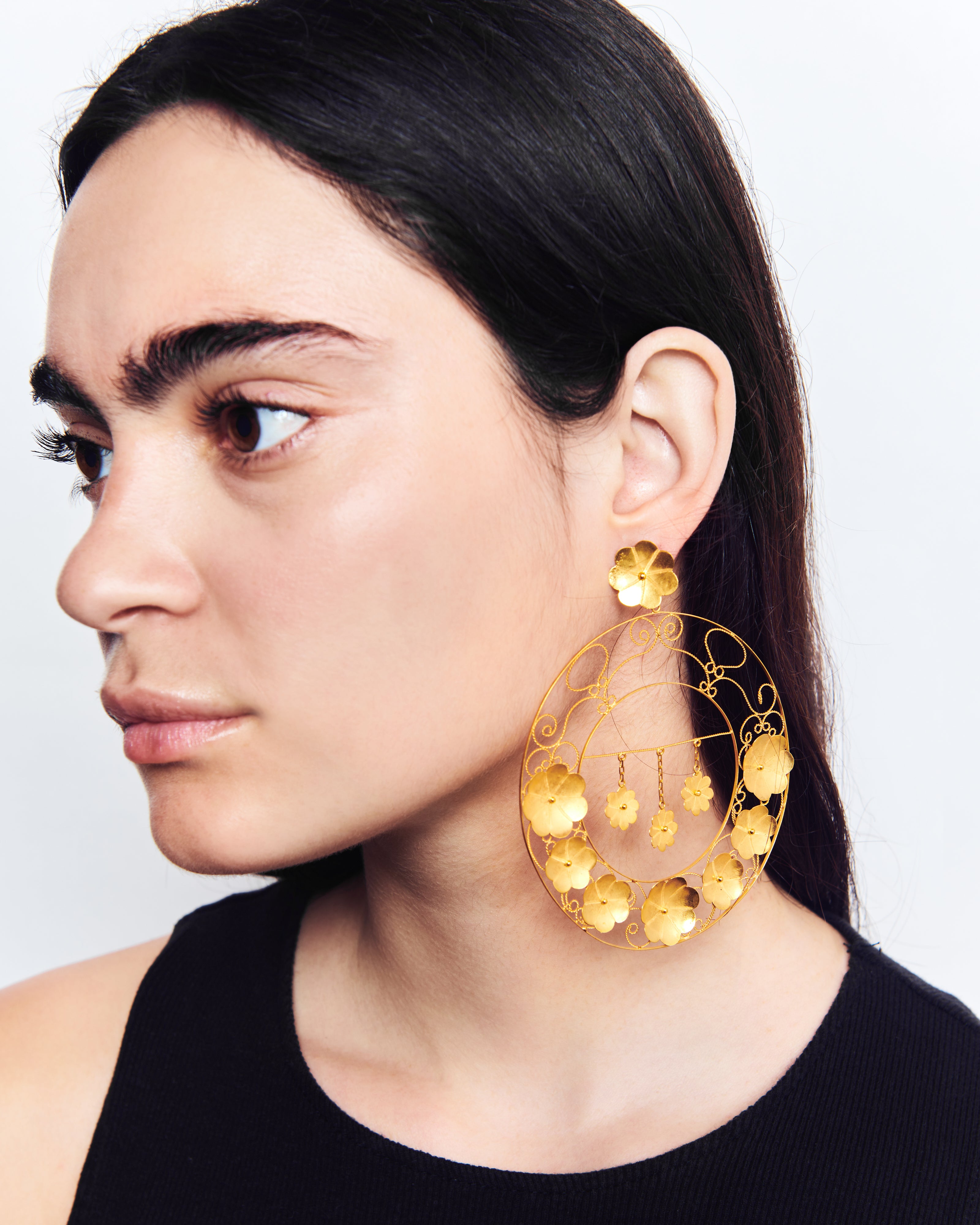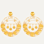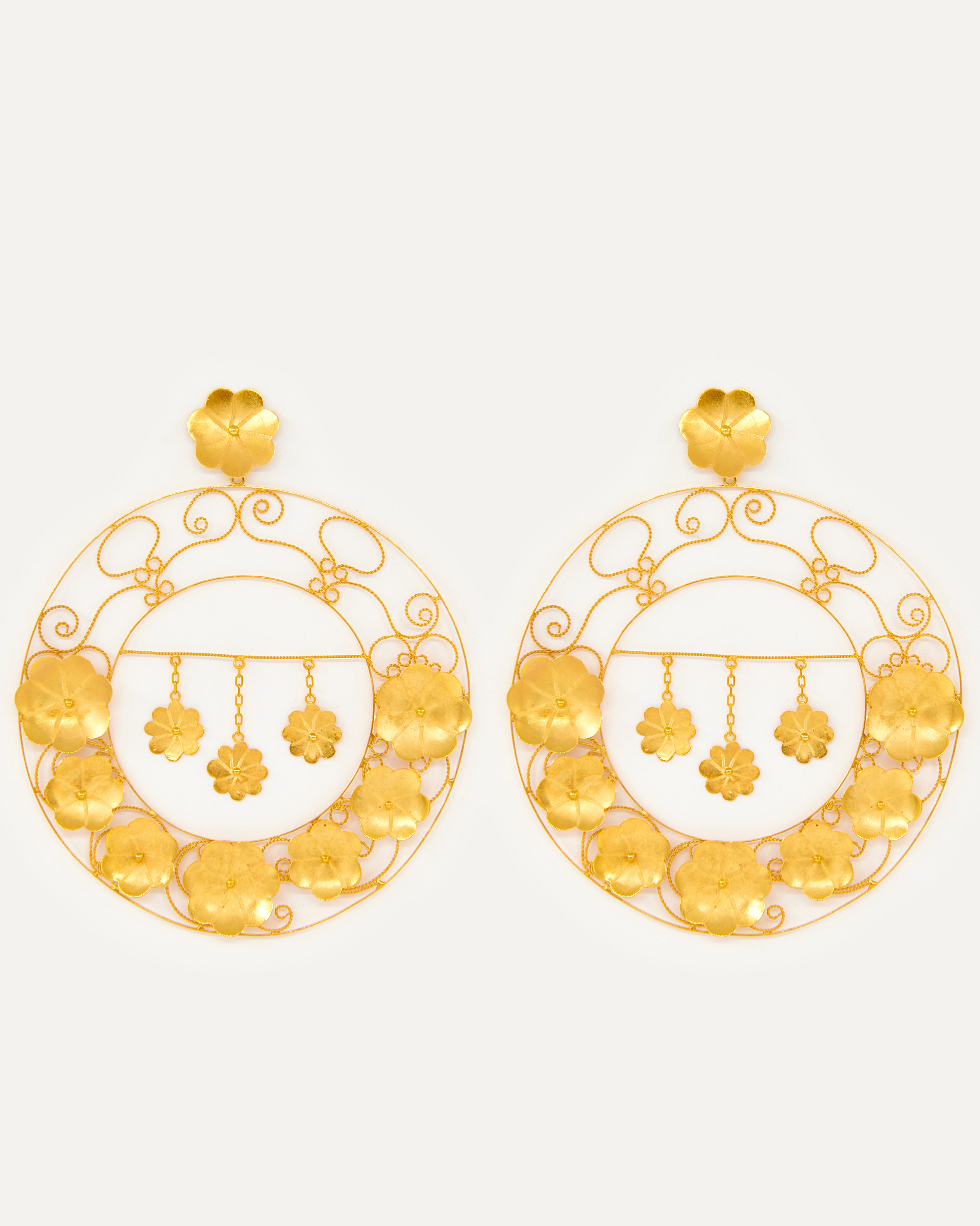 Pendientes inspirados en la clásica 'ferradura' ibicenca. A Elisa, esta tradicional pieza siempre le ha recordado a la Luna, un elemento muy influyente en el movimiento del mar, gran inspiración para la diseñadora. En esta pieza de orfebrería redonda, la joyera ibicenca recrea su particular versión de la acción del viento tras la influencia lunar. Elisa imagina un colosal abanico enmarcado en flores de oro y filigrana fina, y de cuyo centro cuelgan tres estrellas que evocan al cielo. Una corona de luz que con su sutil vaivén acelera el viento y despierta un vendaval de emociones.