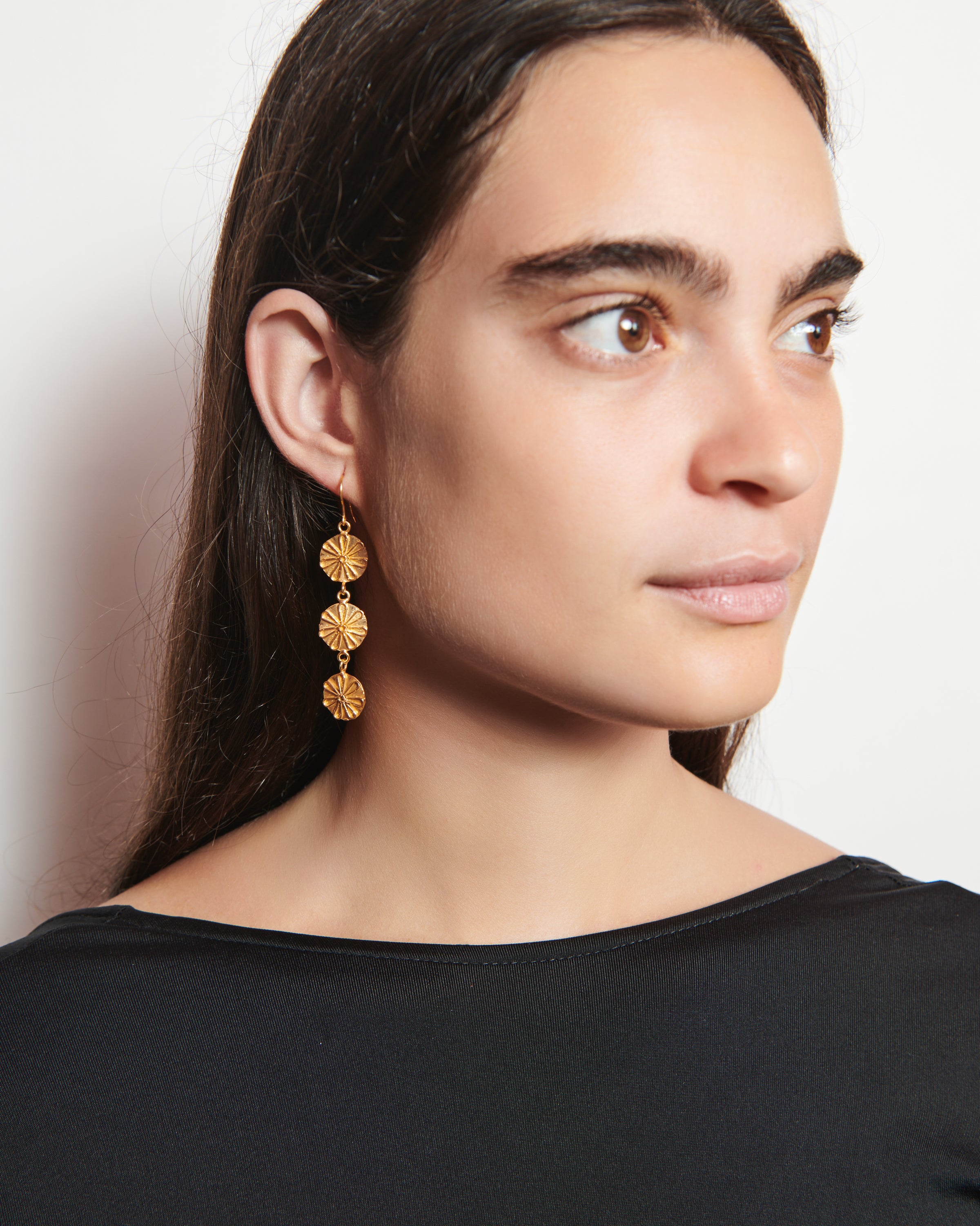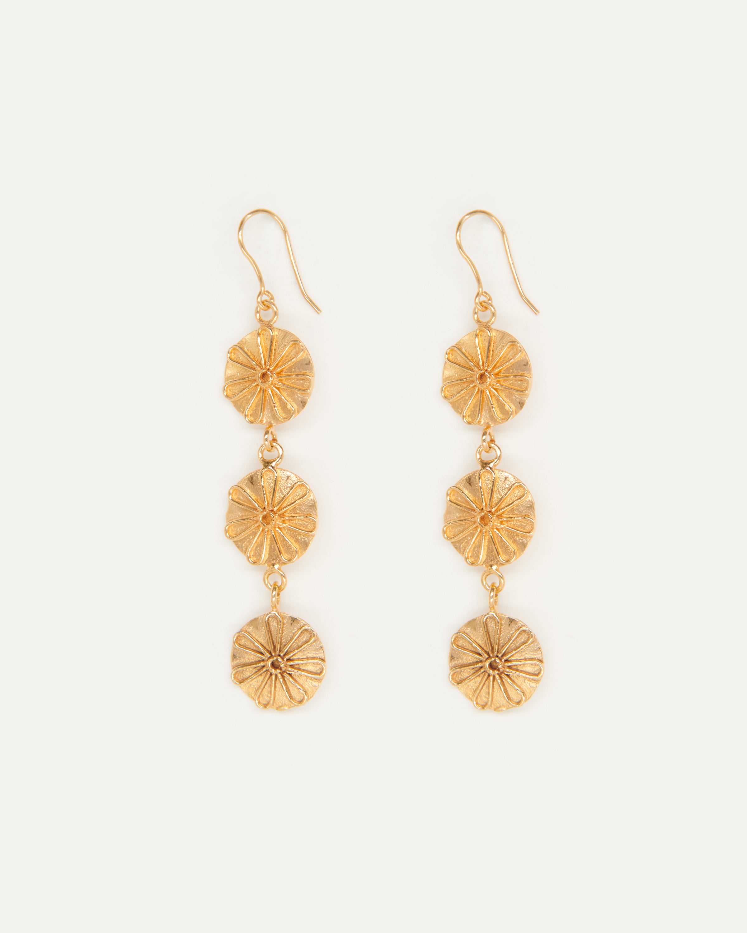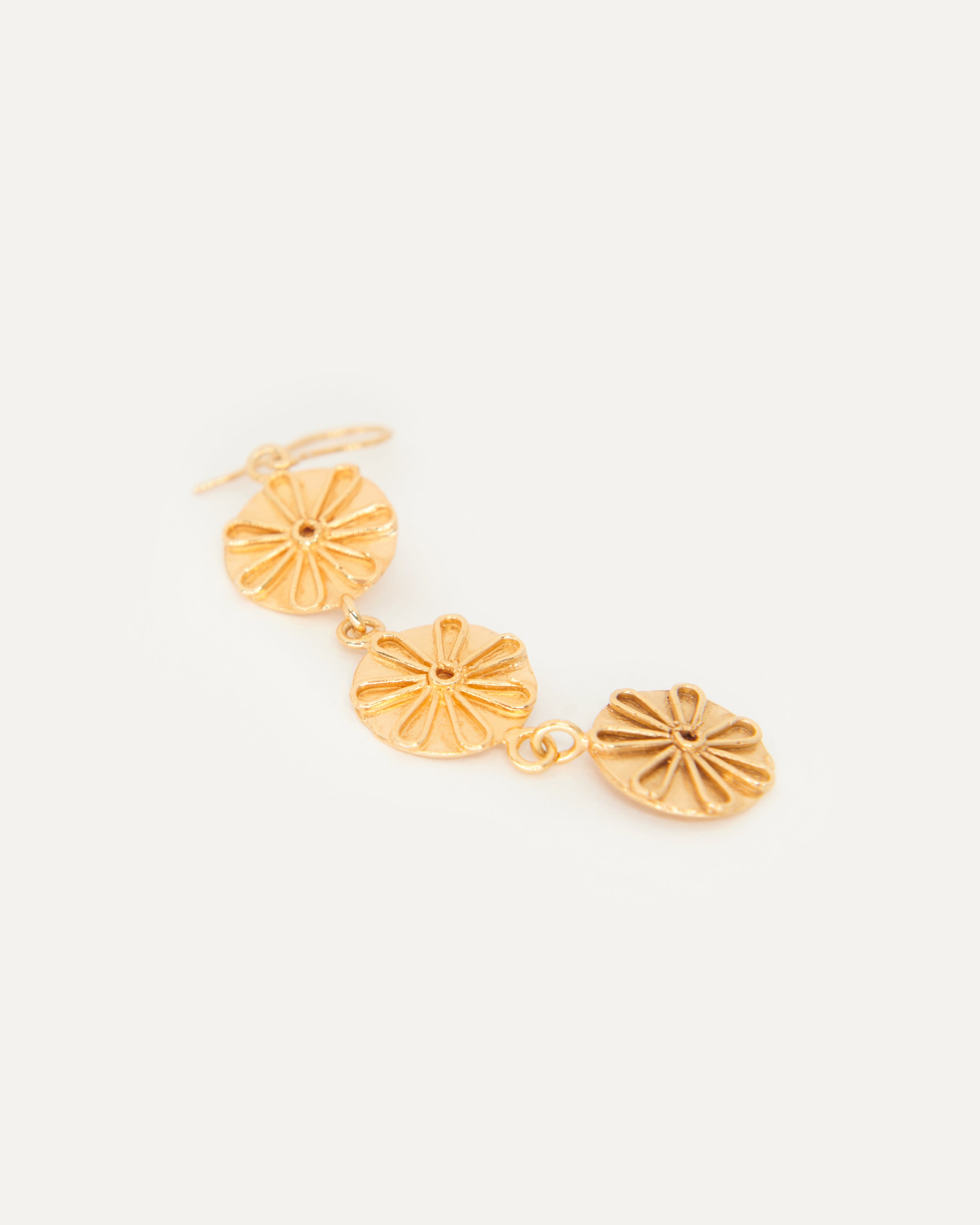 Estos pendientes pertenecen a la edición fenicia, un conjunto de joyas que Elisa crea en honor a la civilización que convirtió Ibiza en un enclave estratégico mundial. Su afán por evolucionar la joyería, el uso de cristales de colores o la fascinación por el oro son rasgos propiamente fenicios que forman parte del ADN de la marca ibicenca. Por esa razón, la diseñadora ha optado por elementos como estas tres flores para homenajear a este pueblo tan influyente en Ibiza.