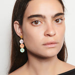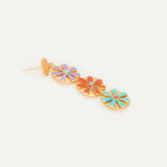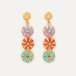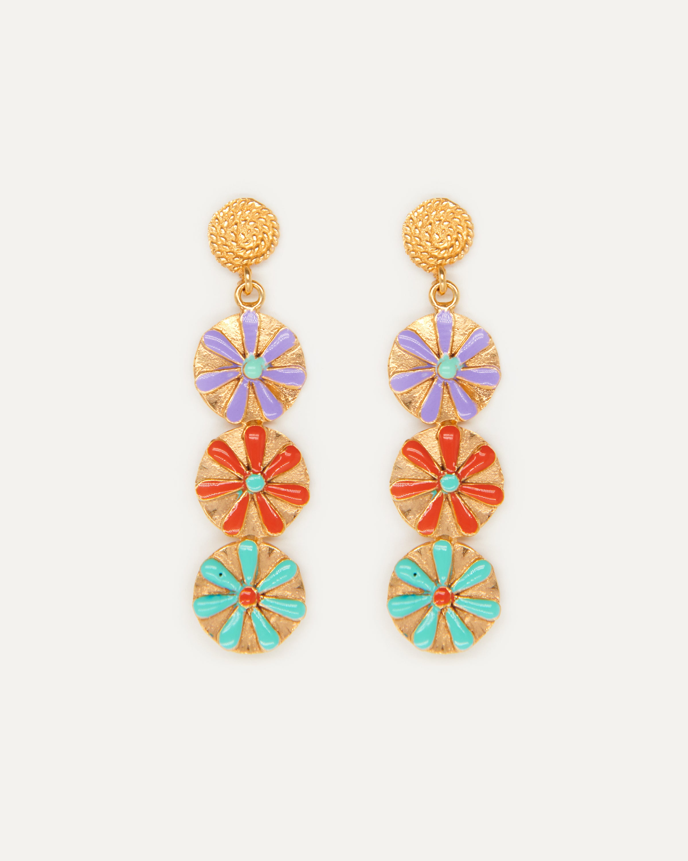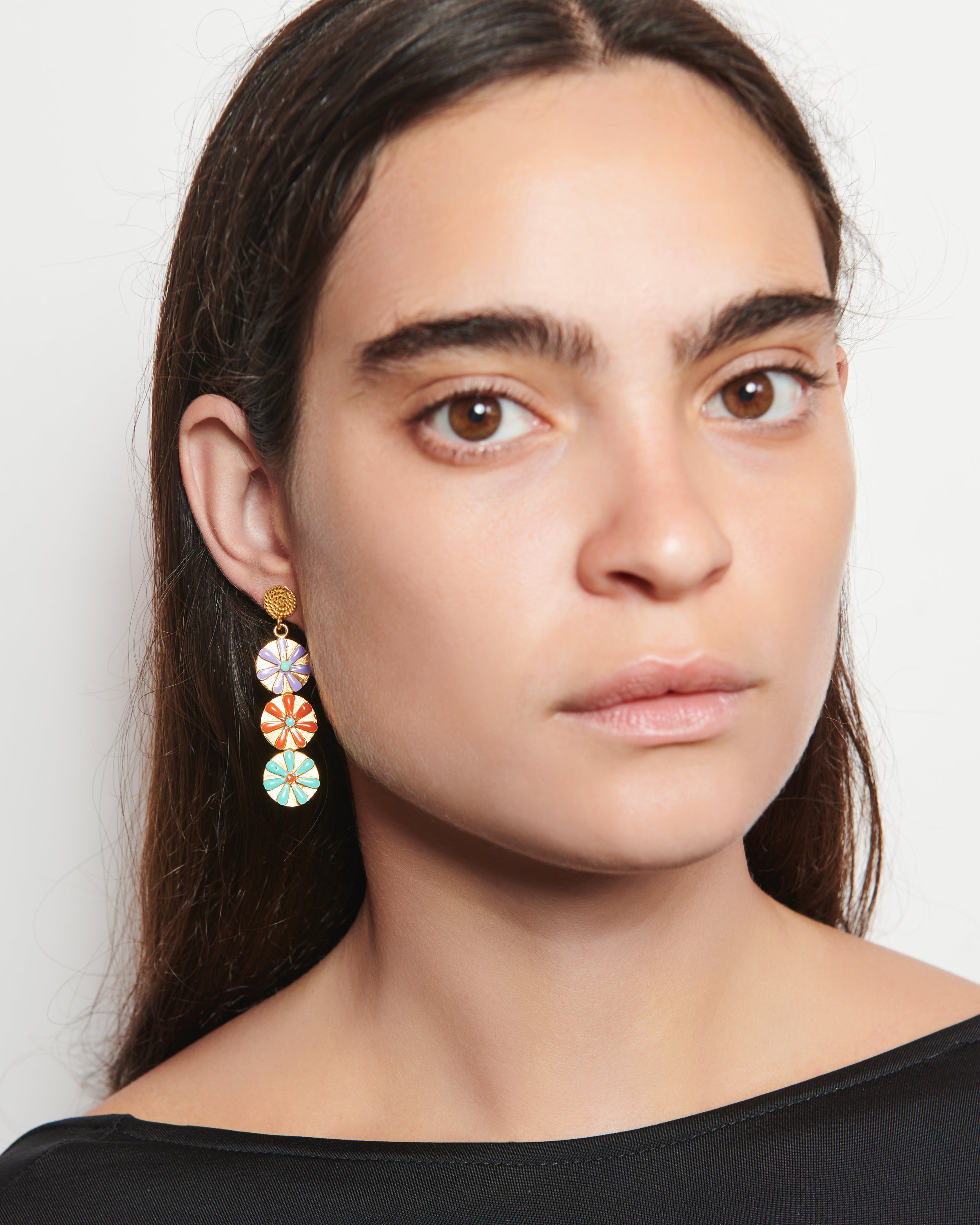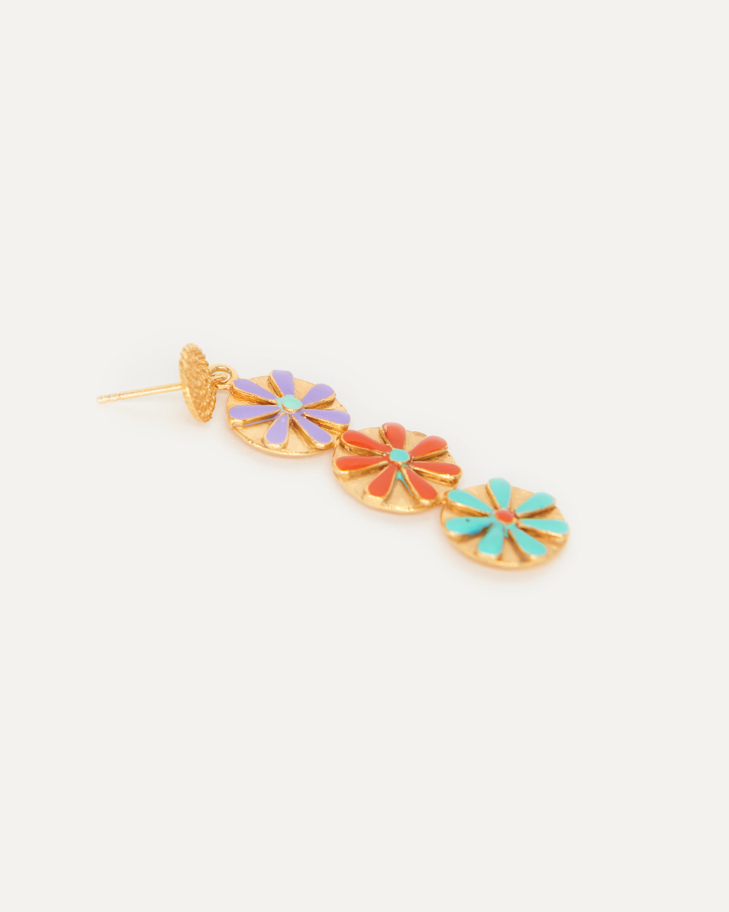 Estos pendientes pertenecen a la edición fenicia, un conjunto de joyas que Elisa crea en honor a la civilización que convirtió Ibiza en un enclave estratégico mundial. Su afán por evolucionar la joyería, el uso de cristales de colores o la fascinación por el oro son rasgos propiamente fenicios que forman parte del ADN de la marca ibicenca. Por esa razón, la diseñadora ha optado por elementos como estas tres flores con esmalte de diferente color para homenajear a este pueblo tan influyente en Ibiza.