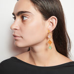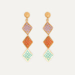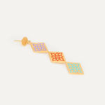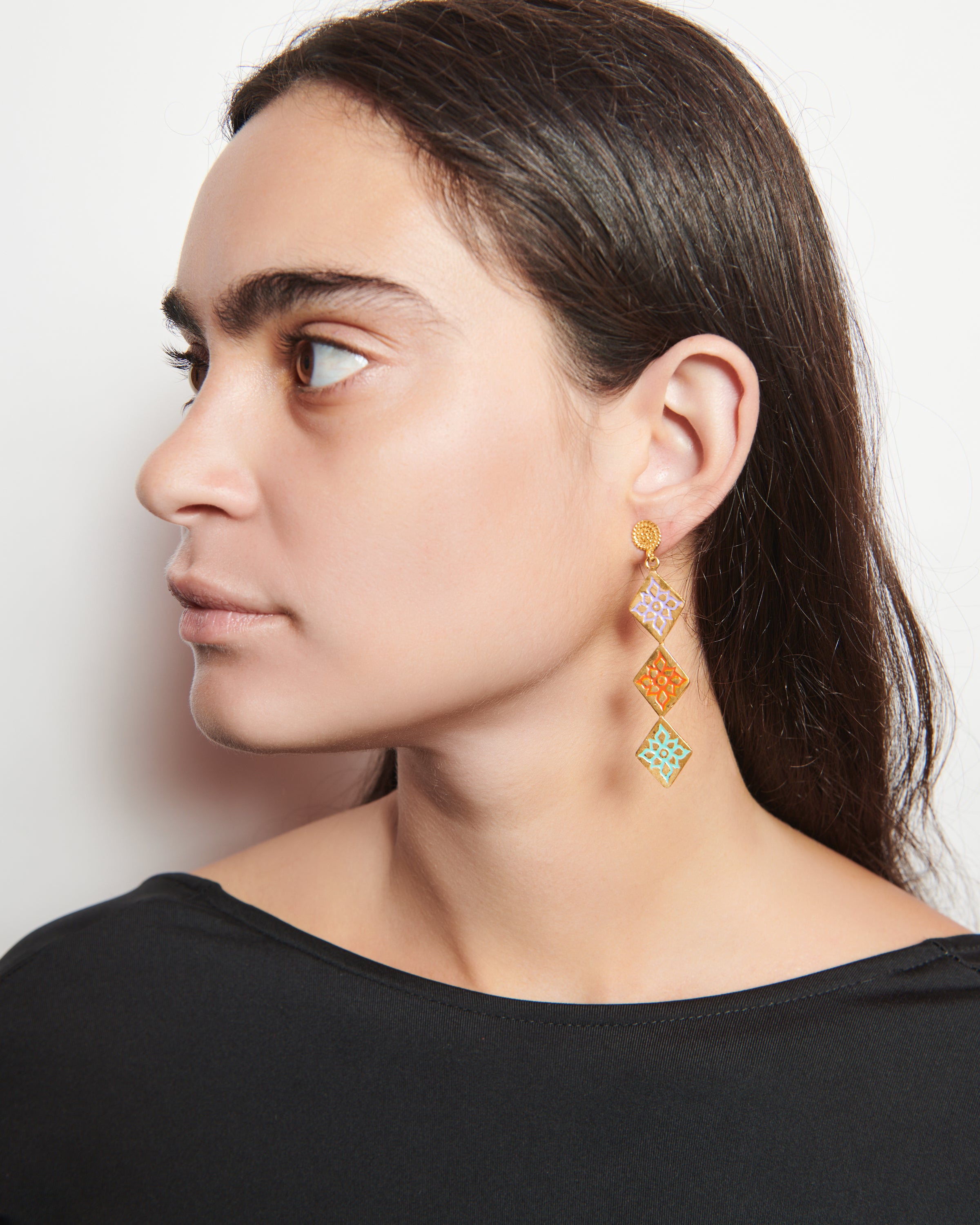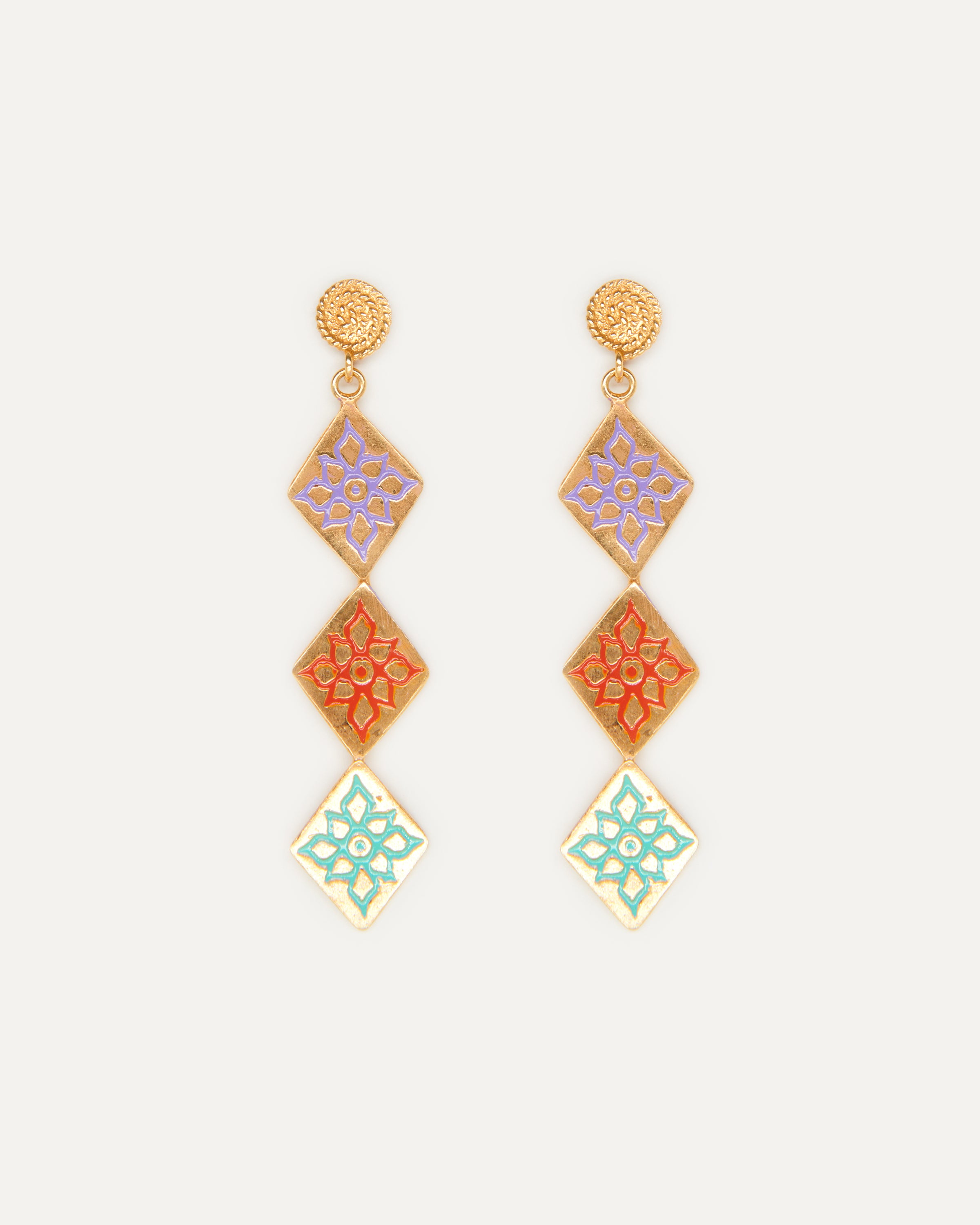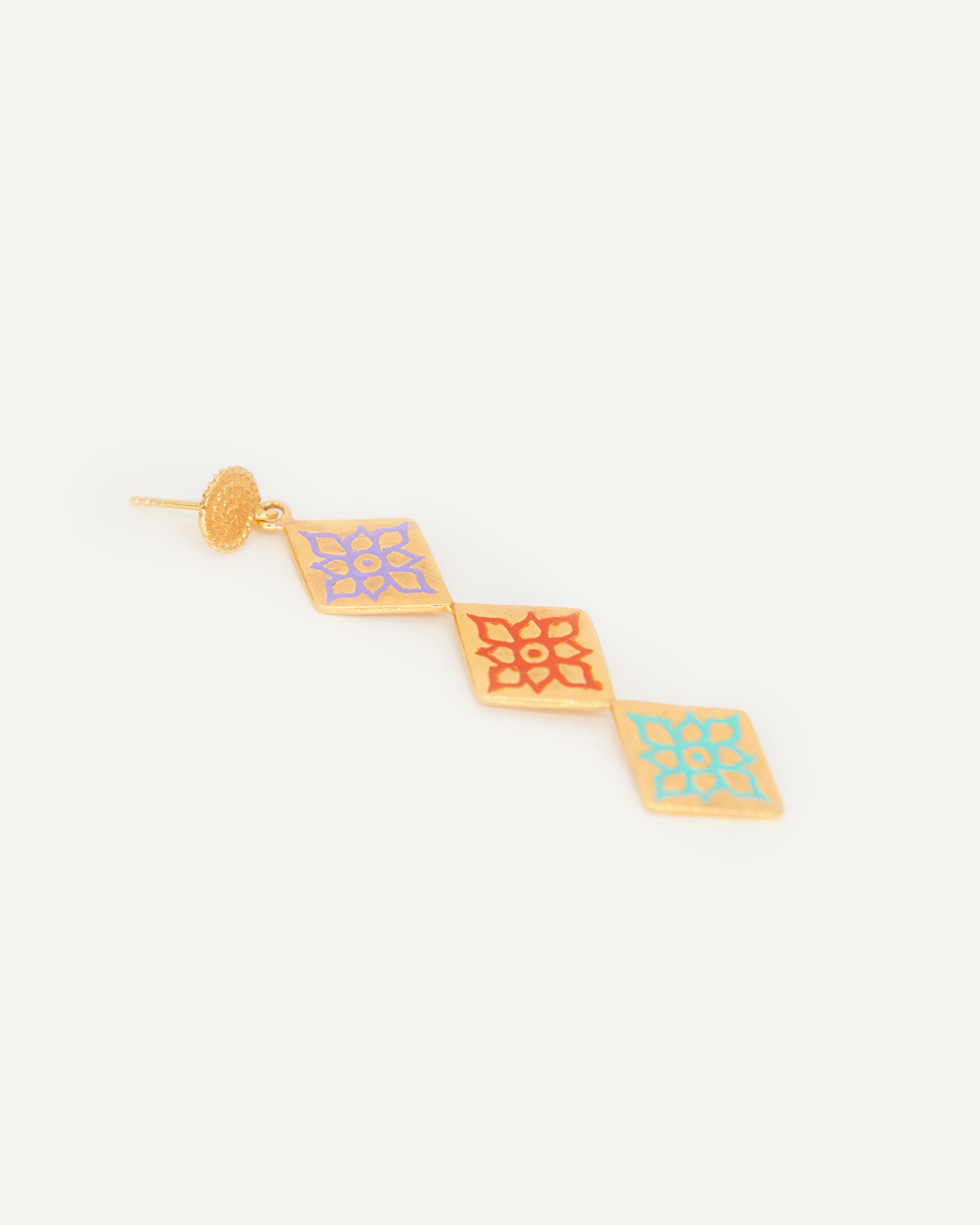 Estos pendientes pertenece a la edición fenicia, un conjunto de joyas que Elisa crea en honor a la civilización que convirtió Ibiza en un enclave estratégico mundial. Su afán por evolucionar la joyería, el uso de cristales de colores o la fascinación por el oro son rasgos propiamente fenicios que forman parte del ADN de la marca ibicenca. Por esa razón, la diseñadora ha optado por elementos como este rombo grabado y con esmalte de diferente color para homenajear a este pueblo tan influyente en Ibiza.
