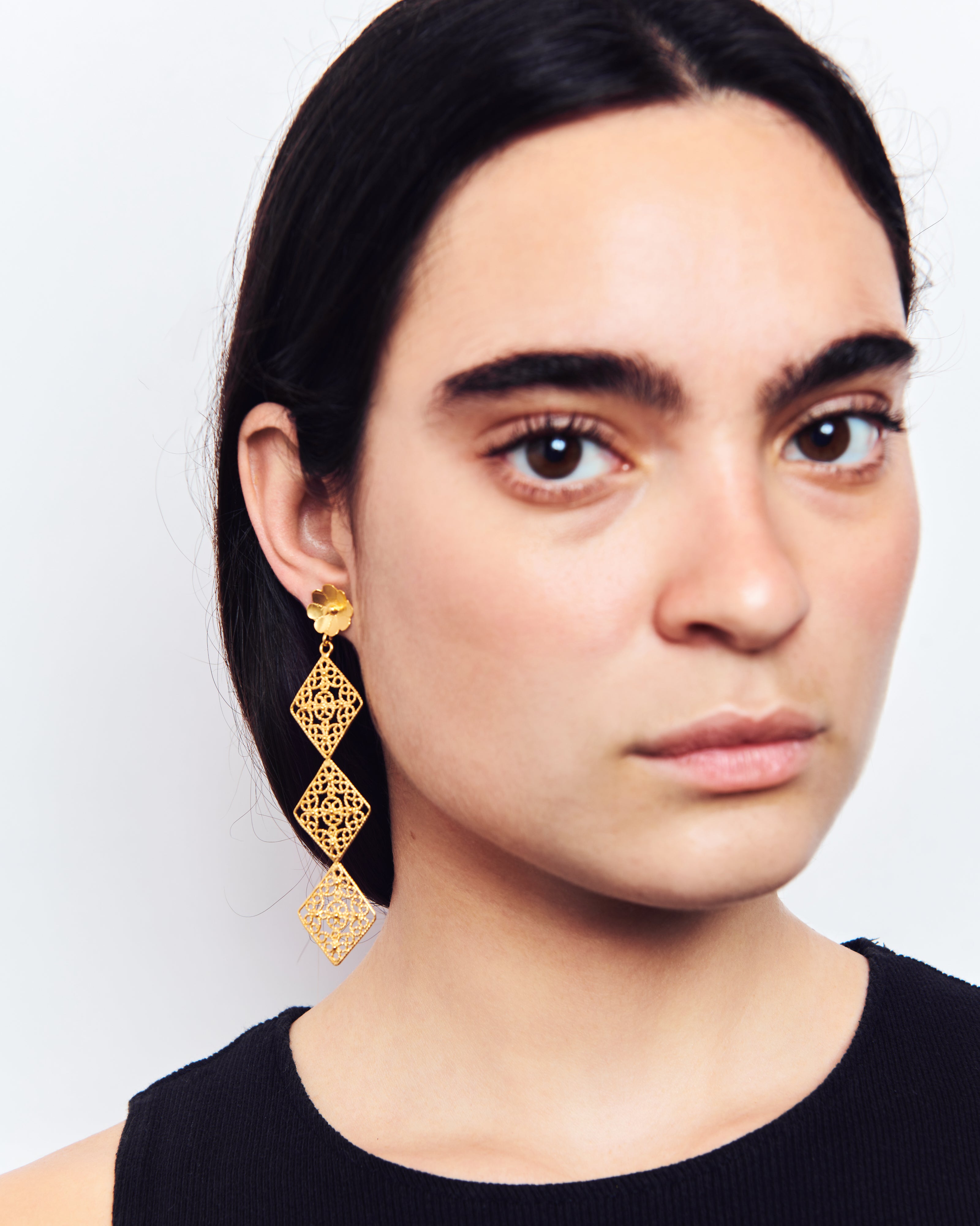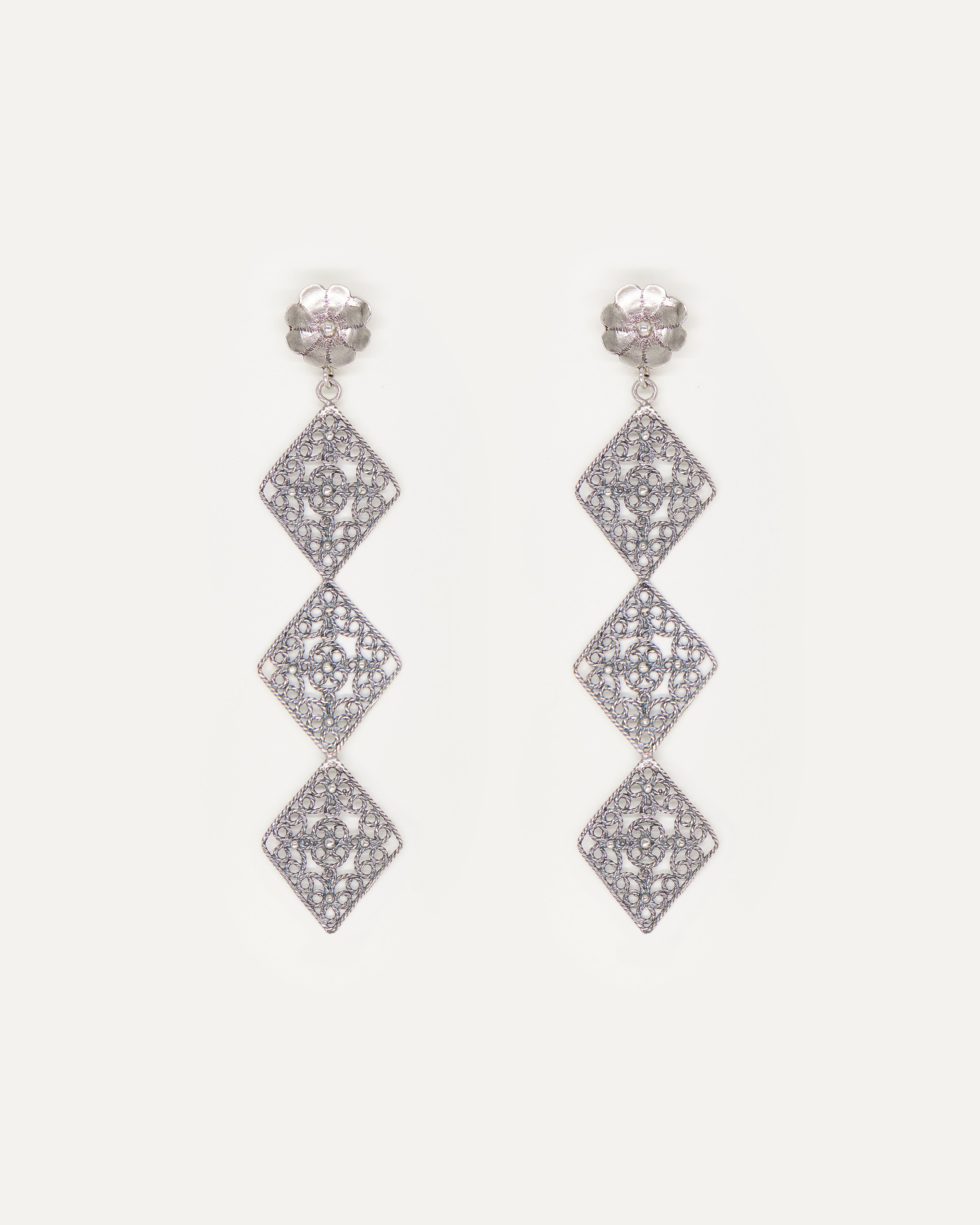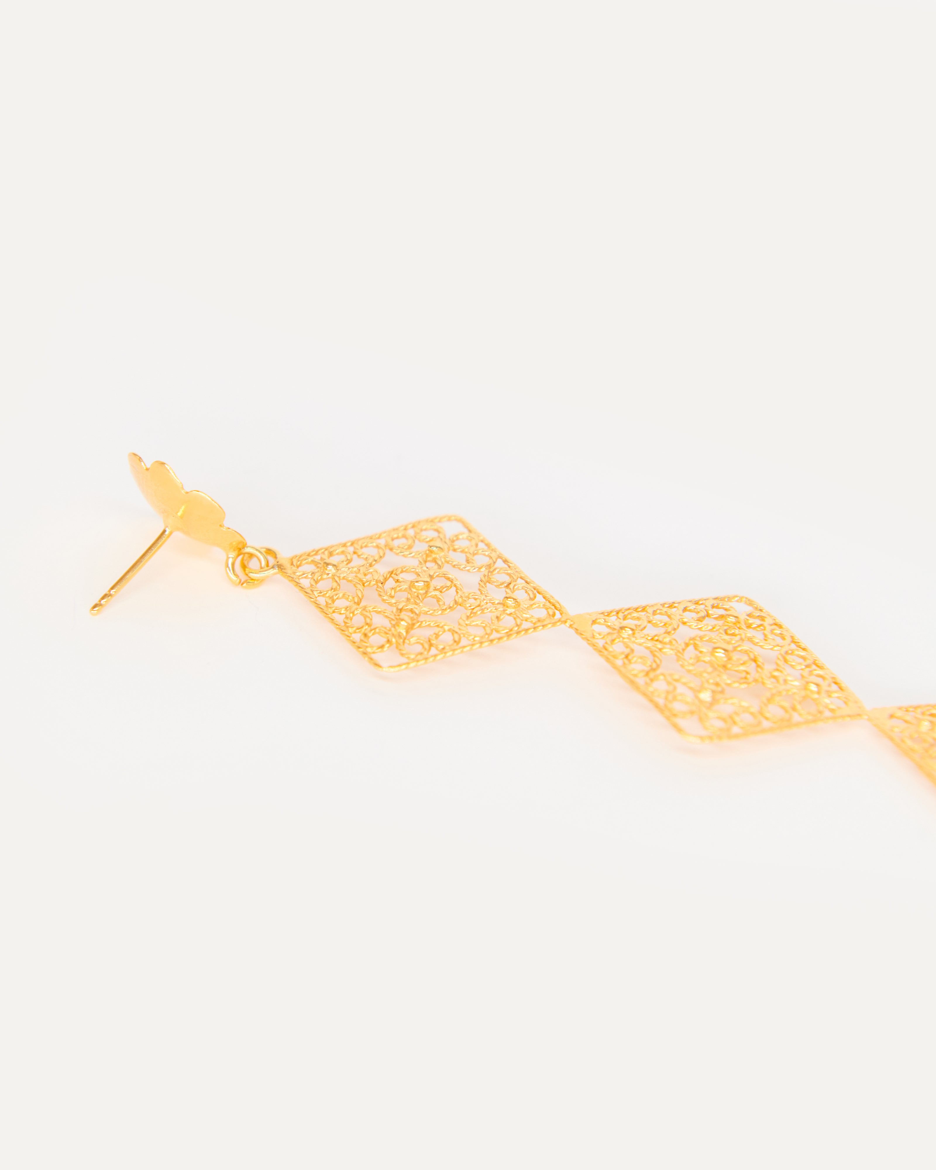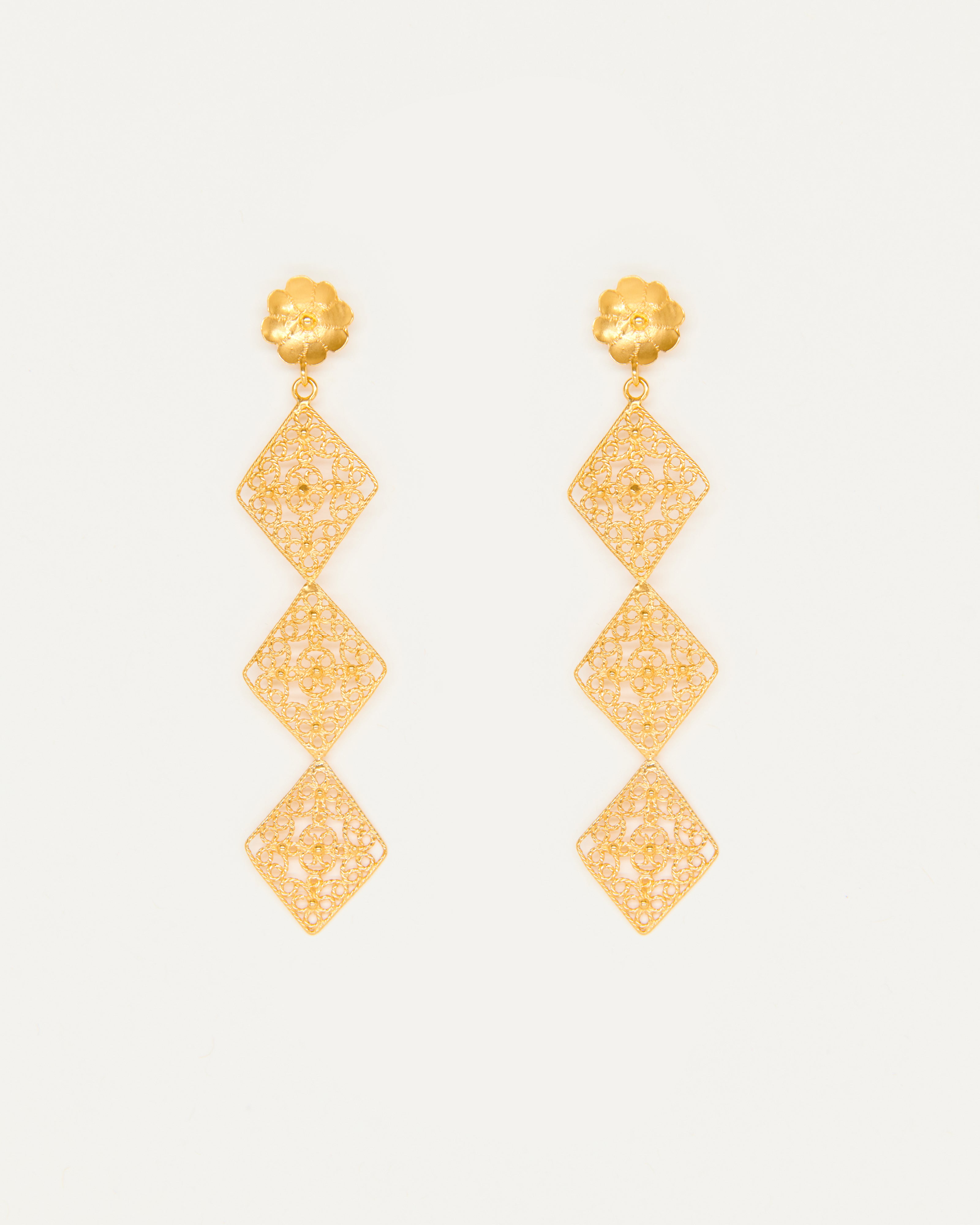 Pendientes con un diseño propio de Elisa e inspirados en el Gra d'Ordi de la Emprendada ibicenca. El nombre 'Gra d'Ordi' se debe a la similitud de la joya, que tiene forma de rombo, con el grano de la cebada que tan frecuentada era en los campos ibicencos. En este caso, la diseñadora ideó la filigrana plana con el objetivo de simplificar un trabajo tan elaborado como la filigrana que había usado en sus diseños anteriores. Esta vez, como sello de Elisa Pomar Ibiza, se ha triplicado el Rombo Pla, que ya es considerado un esencial de la marca.