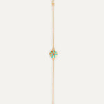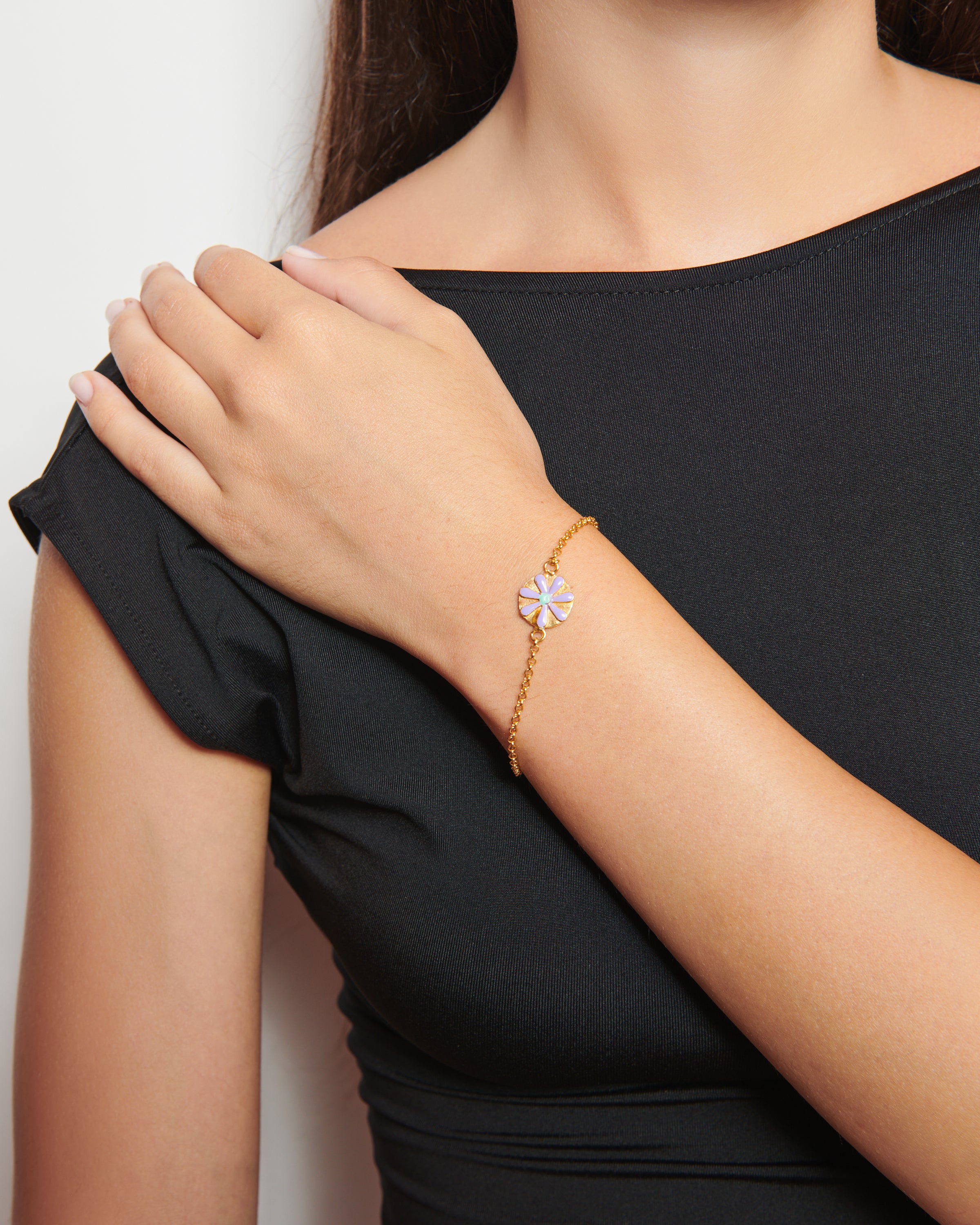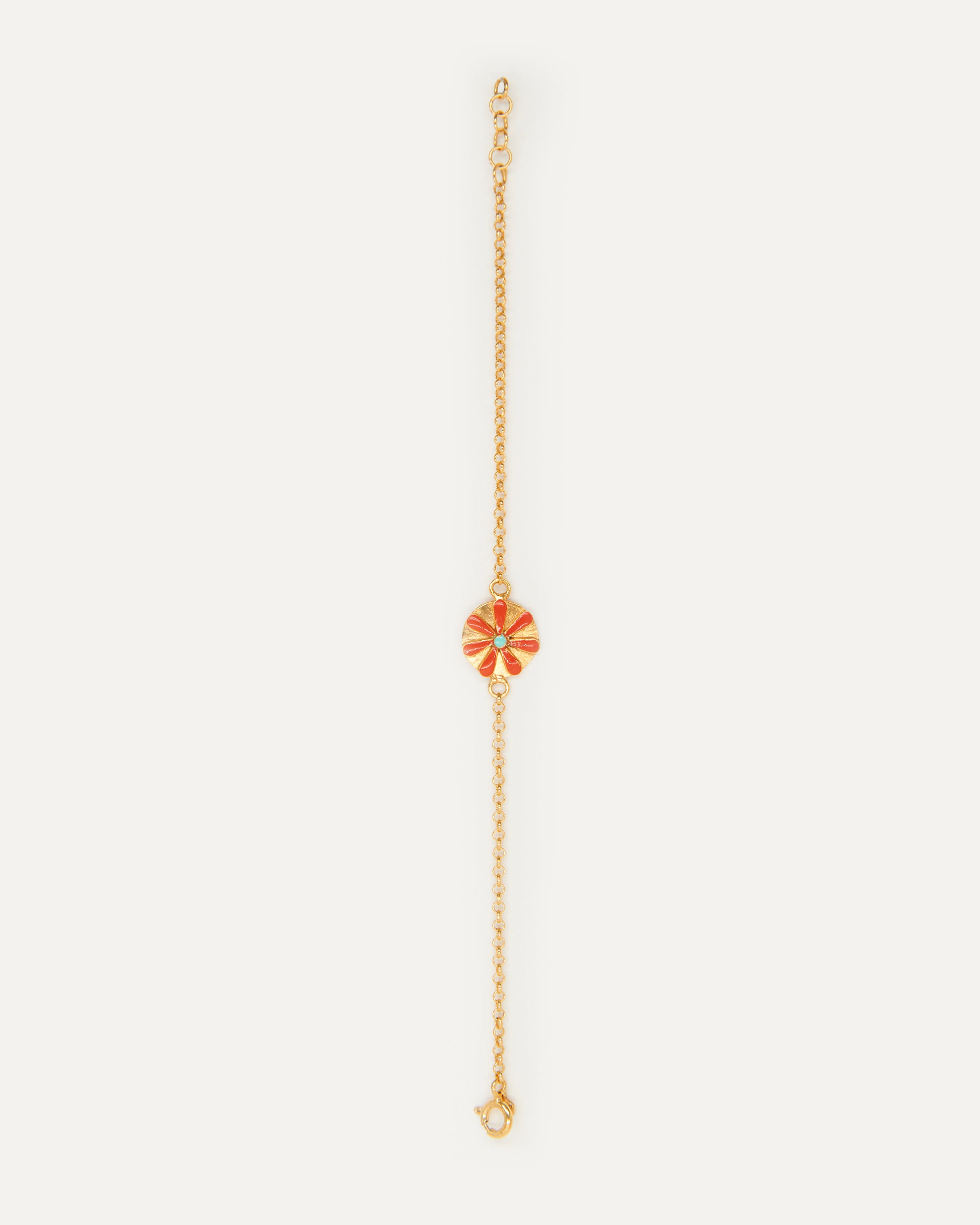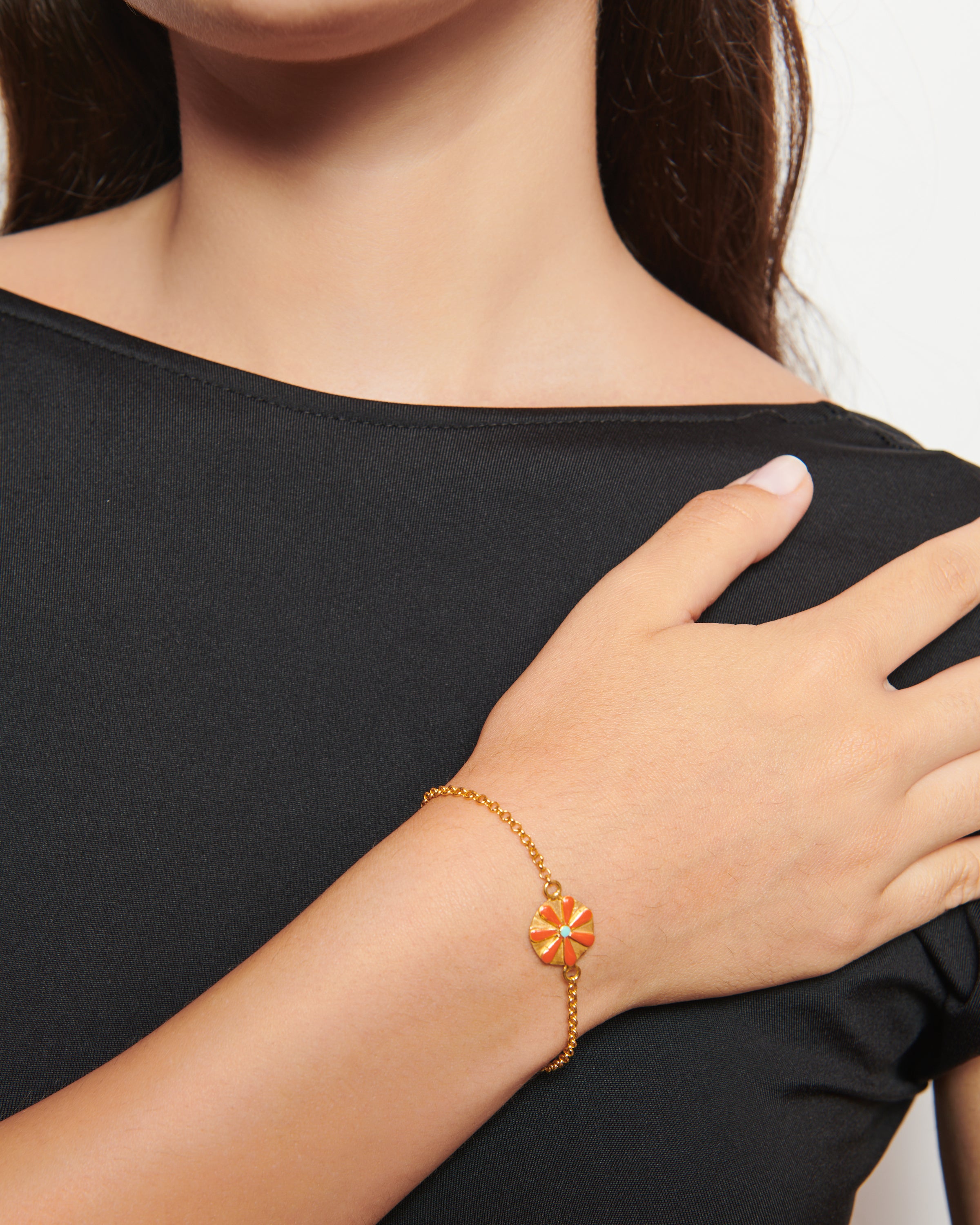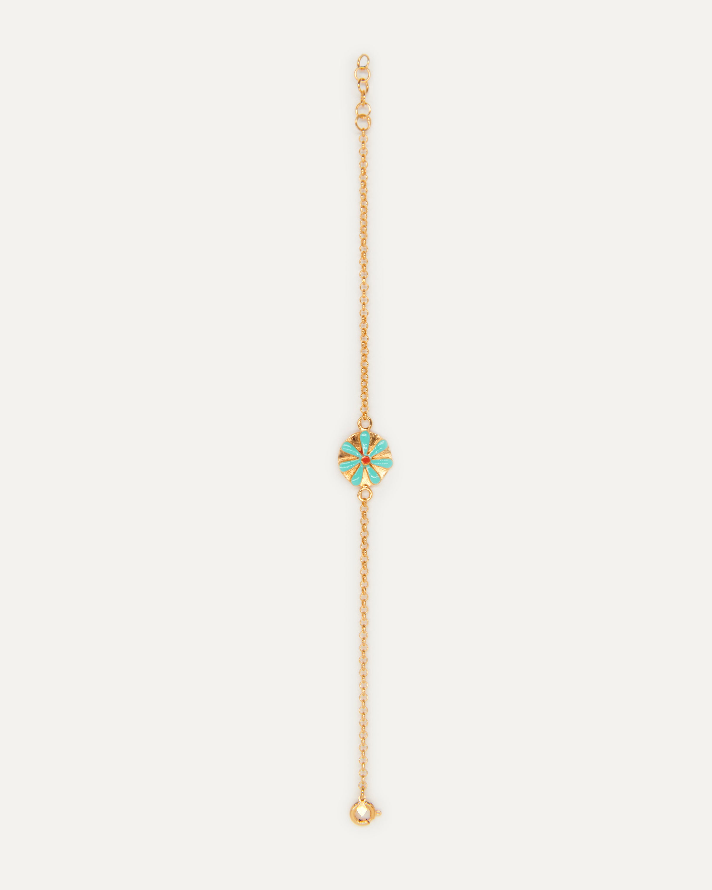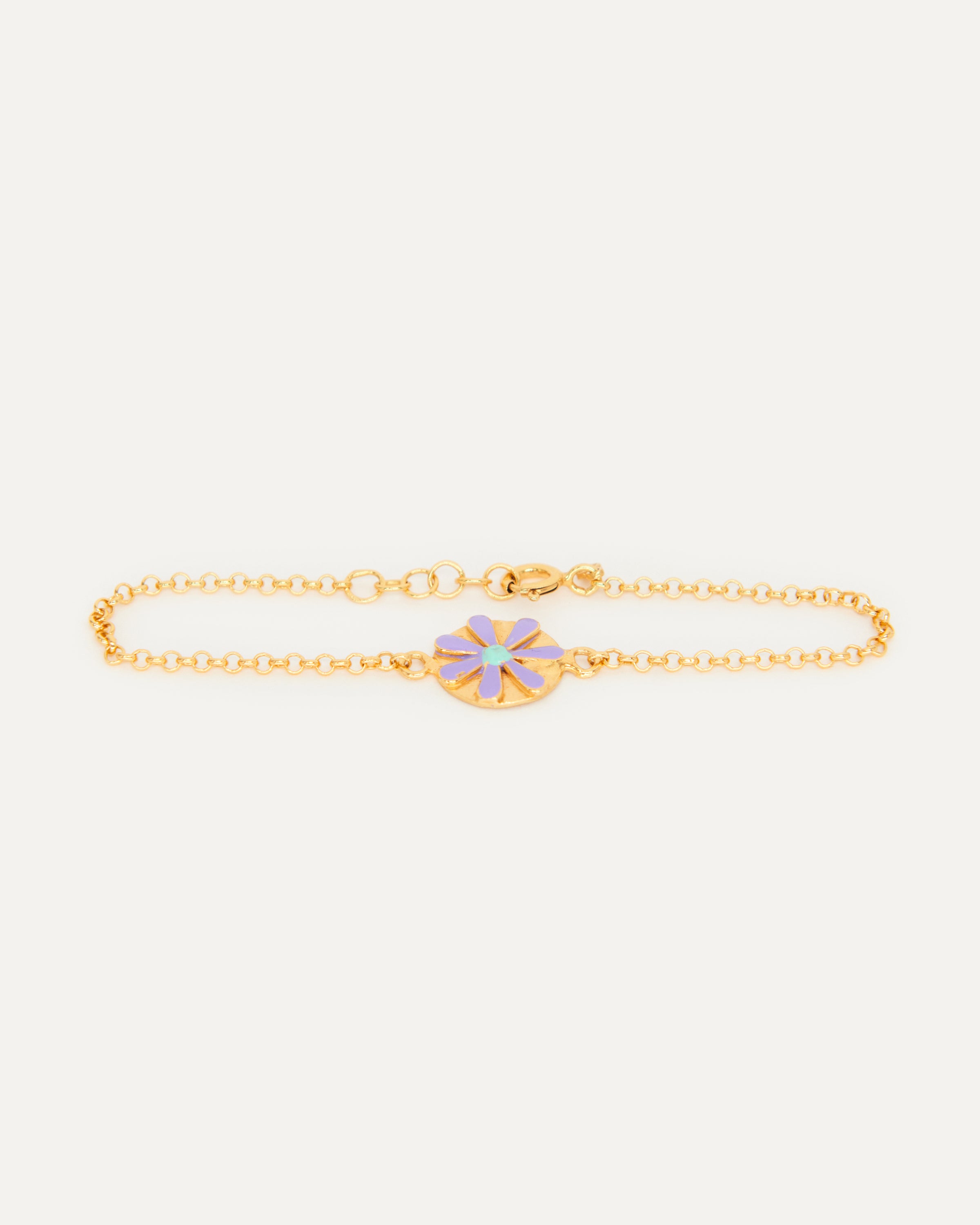 Esta pulsera pertenece a la edición fenicia, un conjunto de joyas que Elisa crea en honor a la civilización que convirtió Ibiza en un enclave estratégico mundial. Su afán por evolucionar la joyería, el uso de cristales de colores o la fascinación por el oro son rasgos propiamente fenicios que forman parte del ADN de la marca ibicenca. Por esa razón, la diseñadora ha optado por elementos como esta flor con esmalte de color para homenajear a este pueblo tan influyente en Ibiza.