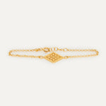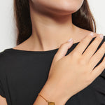 Esta pulsera pertenece a la edición fenicia, un conjunto de joyas que Elisa crea en honor a la civilización que convirtió Ibiza en un enclave estratégico mundial. Su afán por evolucionar la joyería, el uso de cristales de colores o la fascinación por el oro son rasgos propiamente fenicios que forman parte del ADN de la marca ibicenca. Por esa razón, la diseñadora ha optado por elementos como este rombo grabado para homenajear a este pueblo tan influyente en Ibiza.