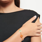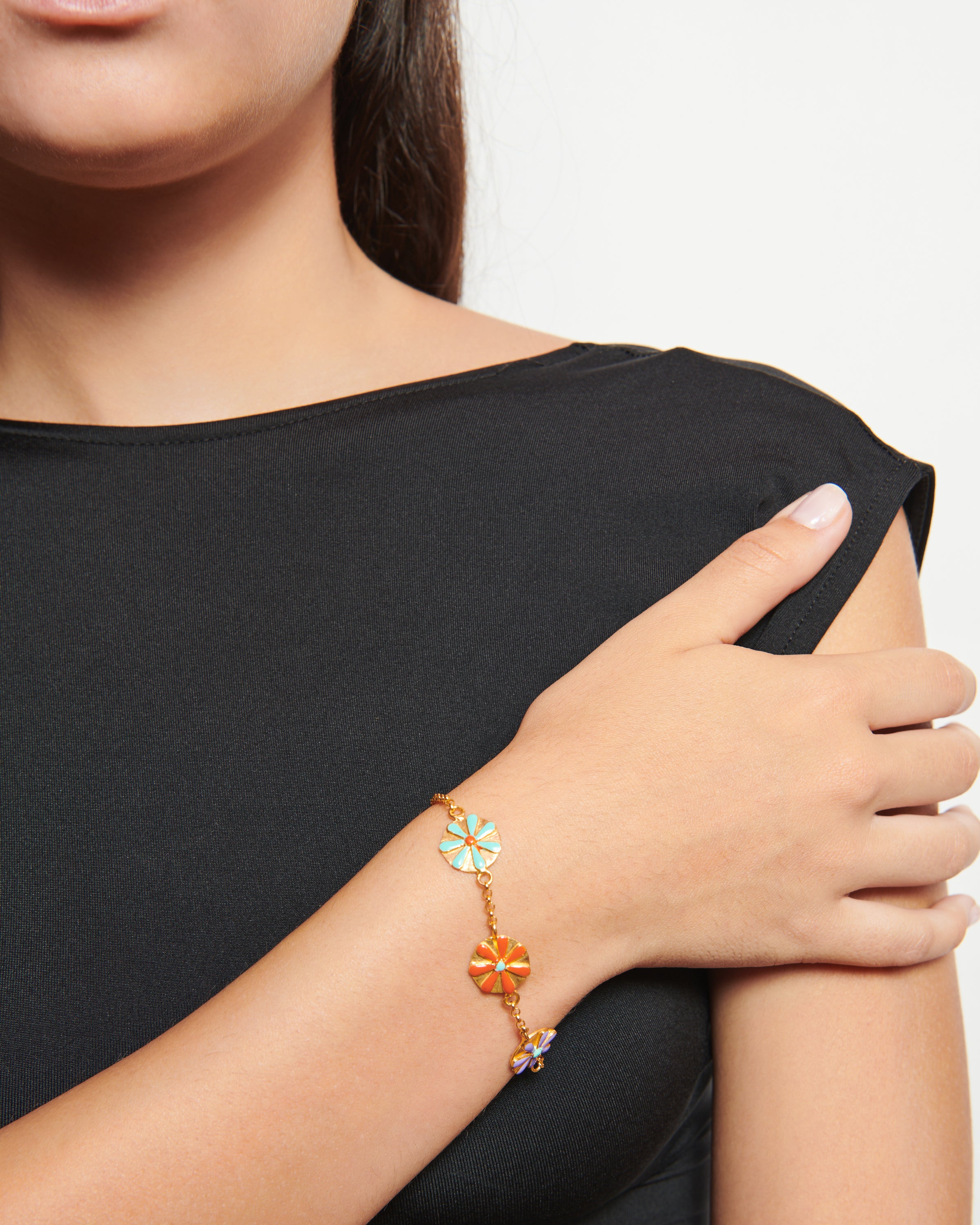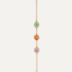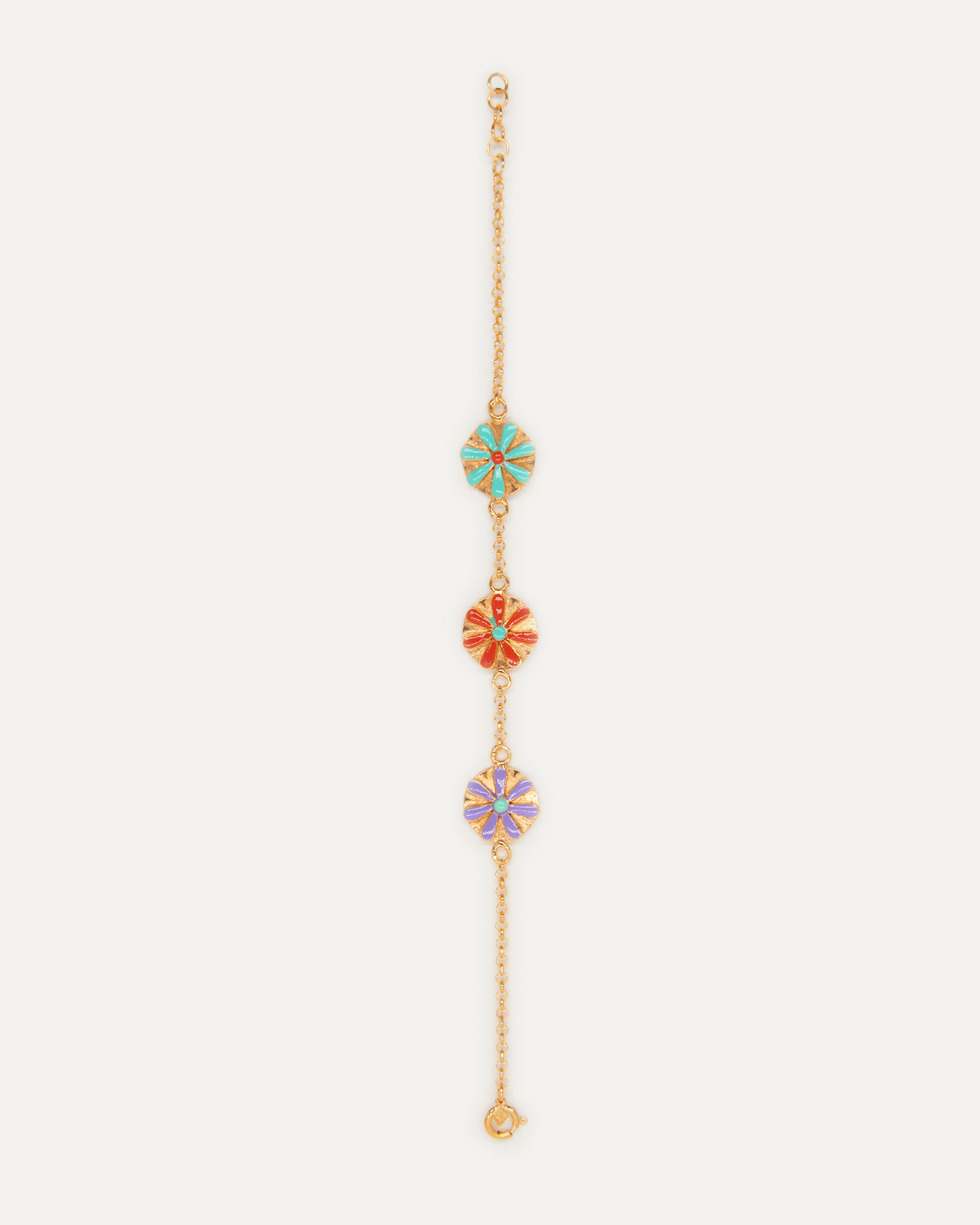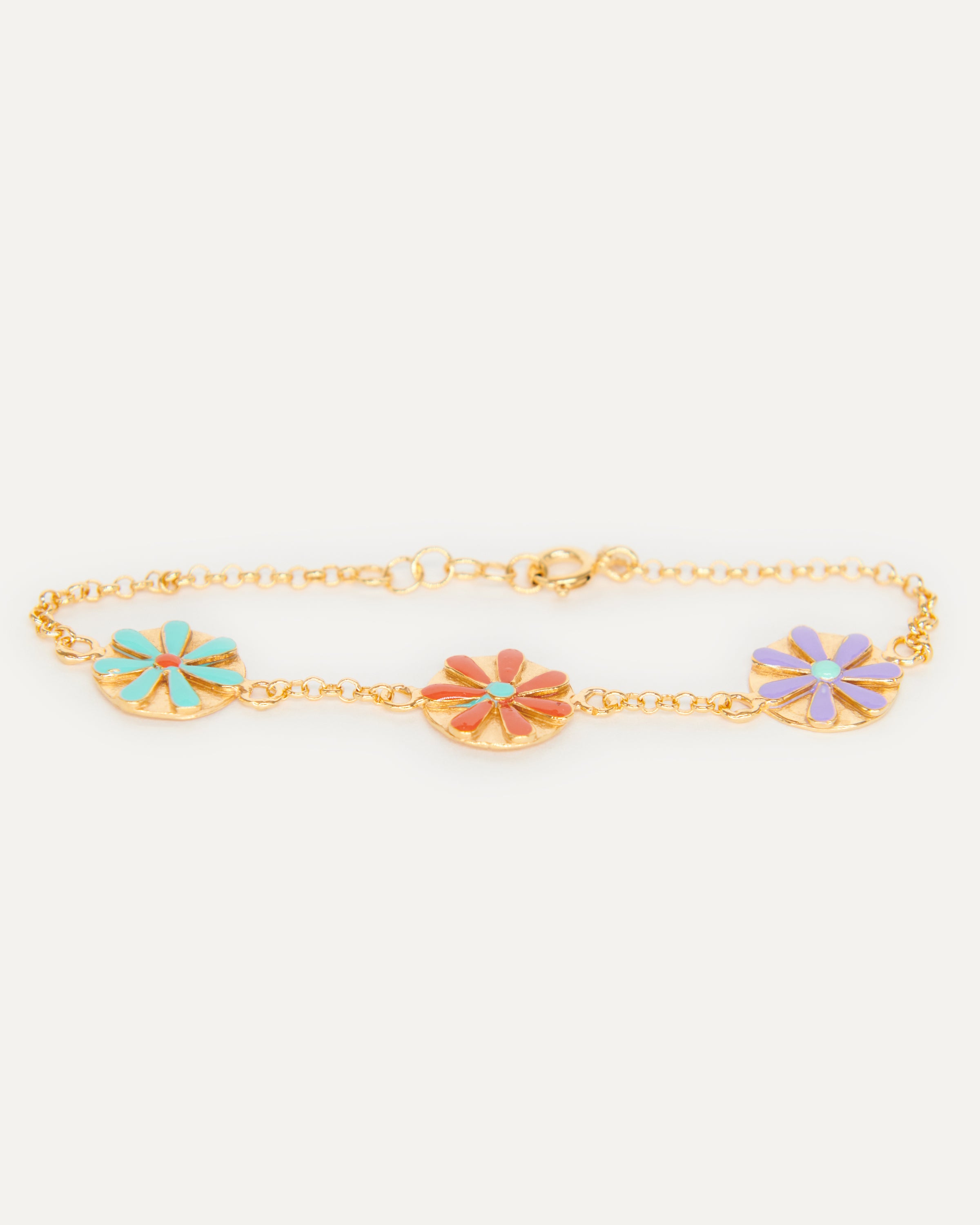 Esta pulsera pertenece a la edición fenicia, un conjunto de joyas que Elisa crea en honor a la civilización que convirtió Ibiza en un enclave estratégico mundial. Su afán por evolucionar la joyería, el uso de cristales de colores o la fascinación por el oro son rasgos propiamente fenicios que forman parte del ADN de la marca ibicenca. Por esa razón, la diseñadora ha optado por elementos como estats tres flores con esmalte de diferente color para homenajear a este pueblo tan influyente en Ibiza.